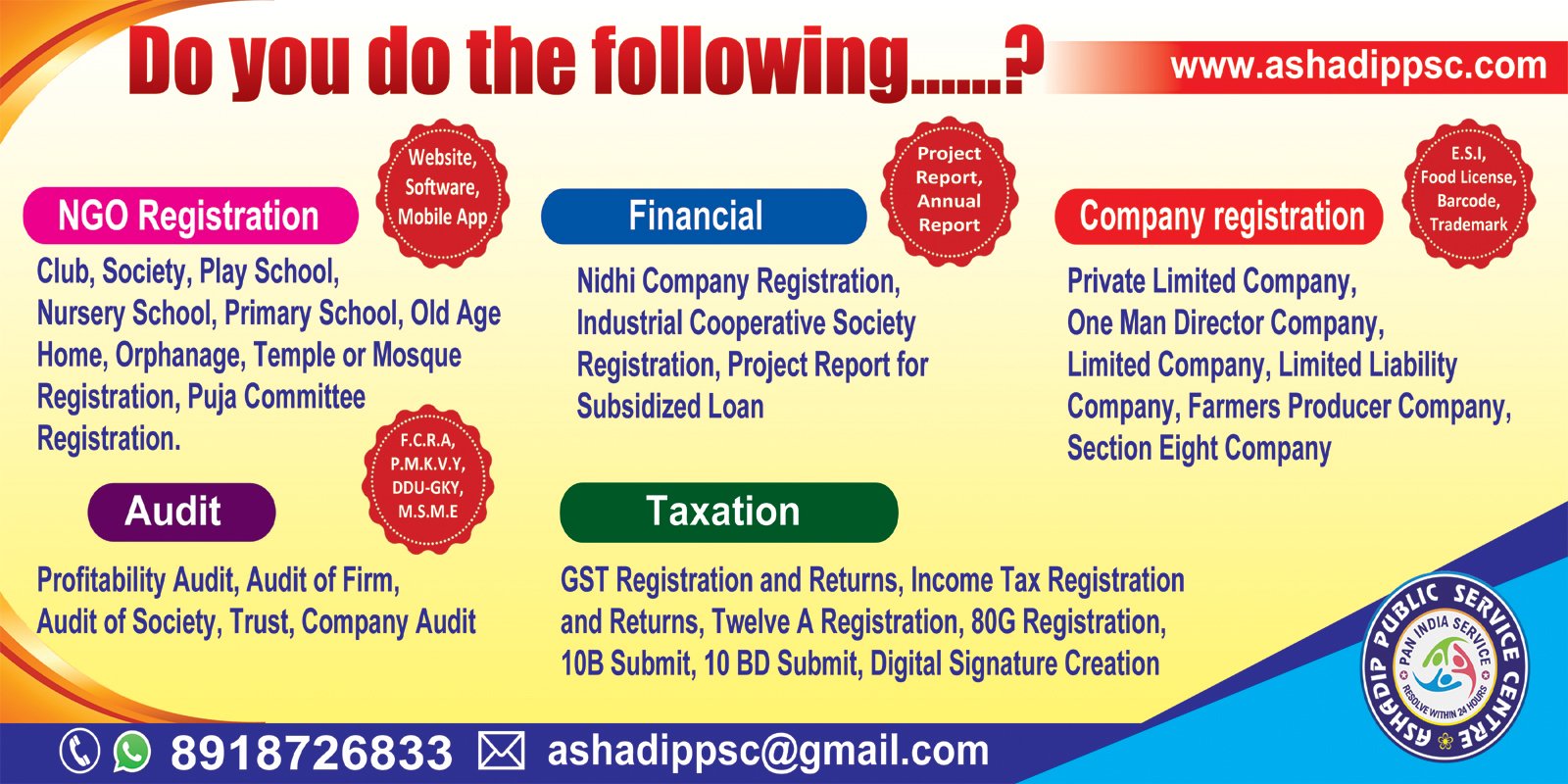 Ashadip Public Service Centre, is one of the leading providers of financial and business advisory, Documents & Details Project Report making, Process of Various Registration and Affiliation , internal audit, statutory audit, GST and Tax Consultation ,corporate governance, & international taxation and regulatory services for NGOs and Corporates.